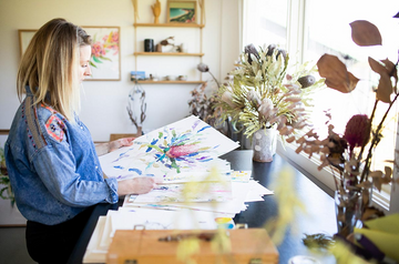 Natalie studied Communication Design at RMIT and maintained a broad creative practice throughout her studies and early career. She fell in love with watercolour early on, experimenting with inks and water-soluble crayons along the way. Her first solo exhibition, Welcome to the Nest (2012), was held in Geelong, and she has since exhibited her landscape and floral works across Australia