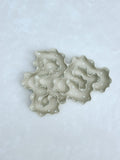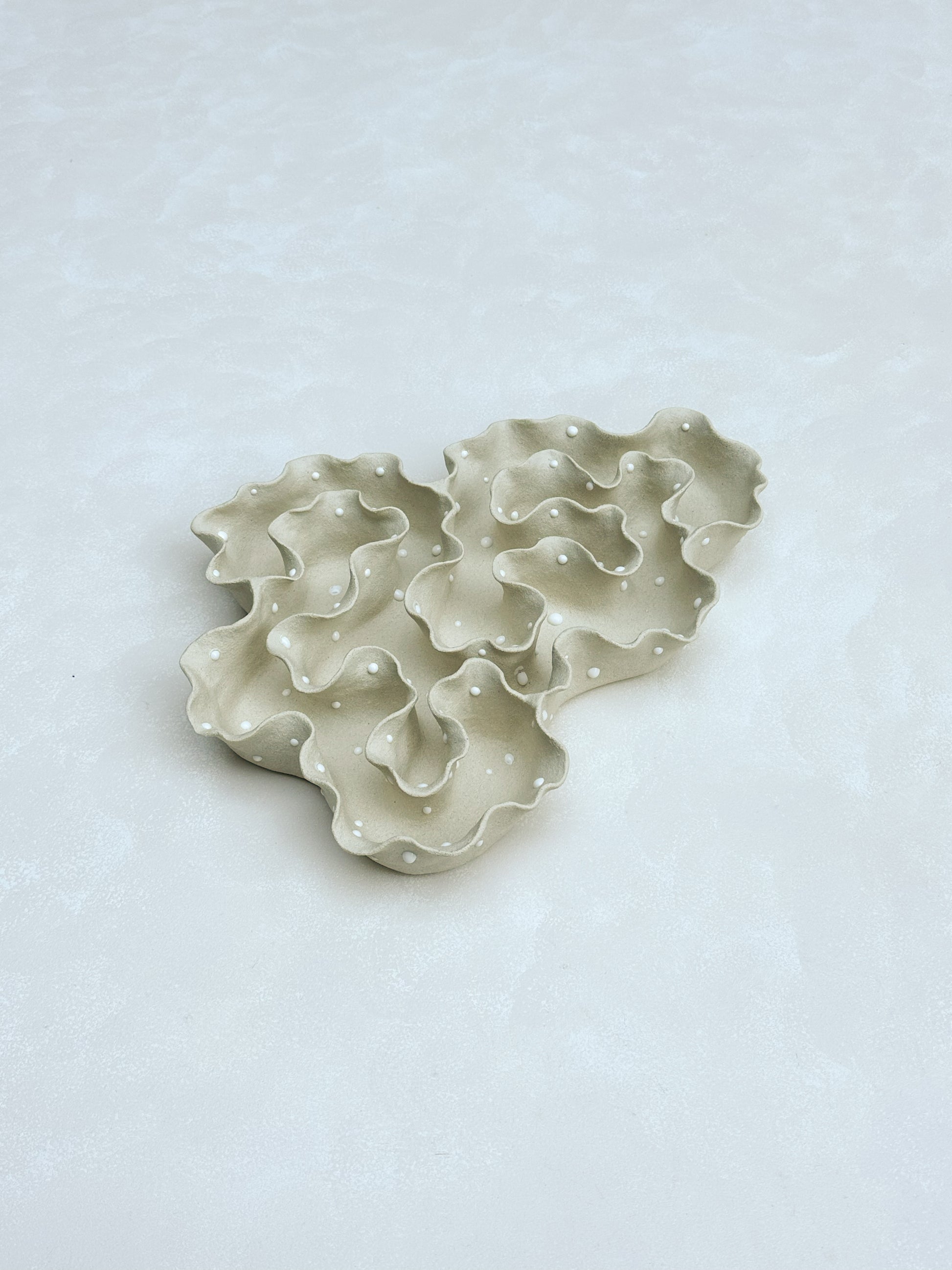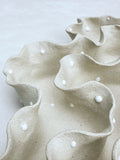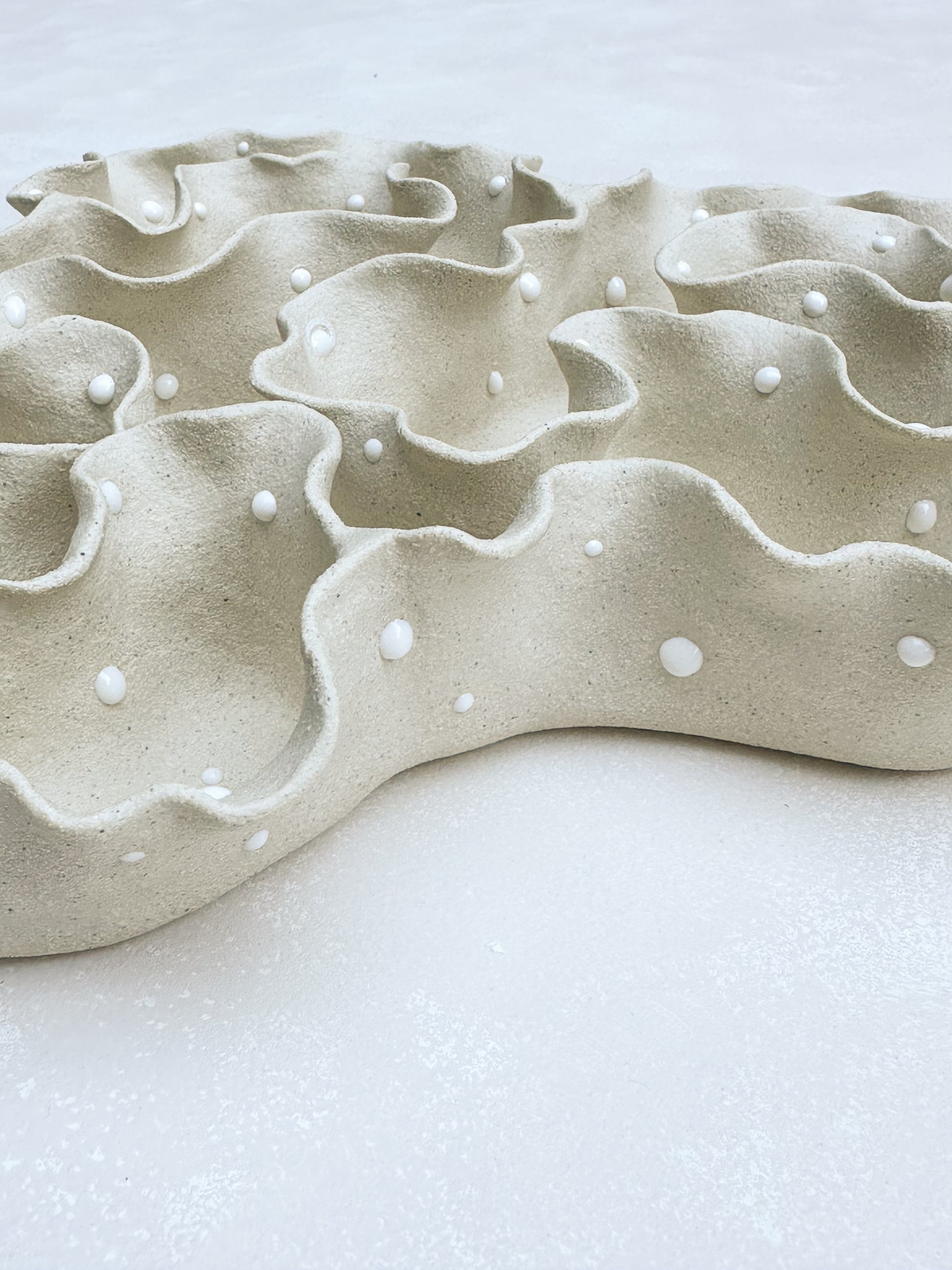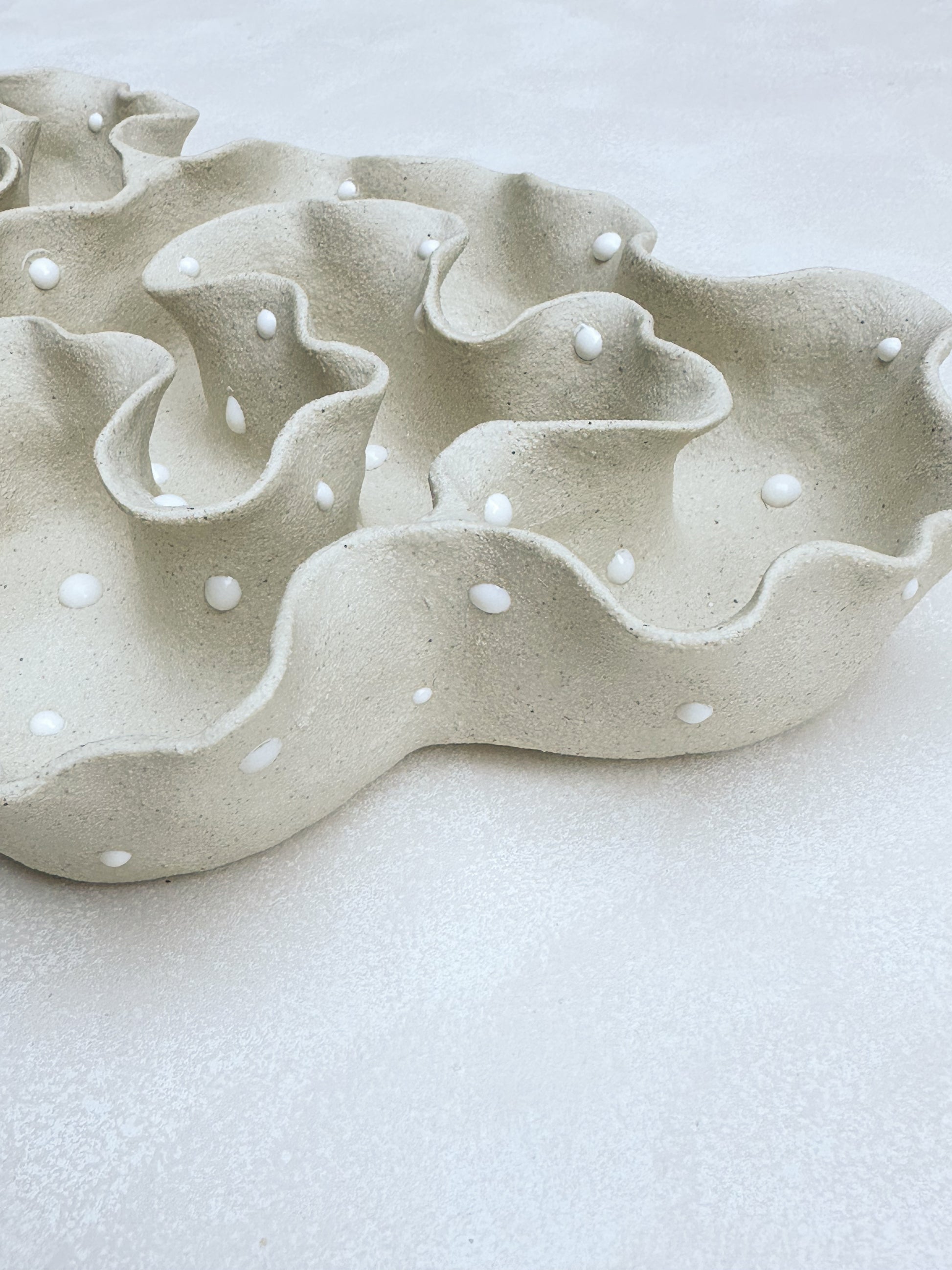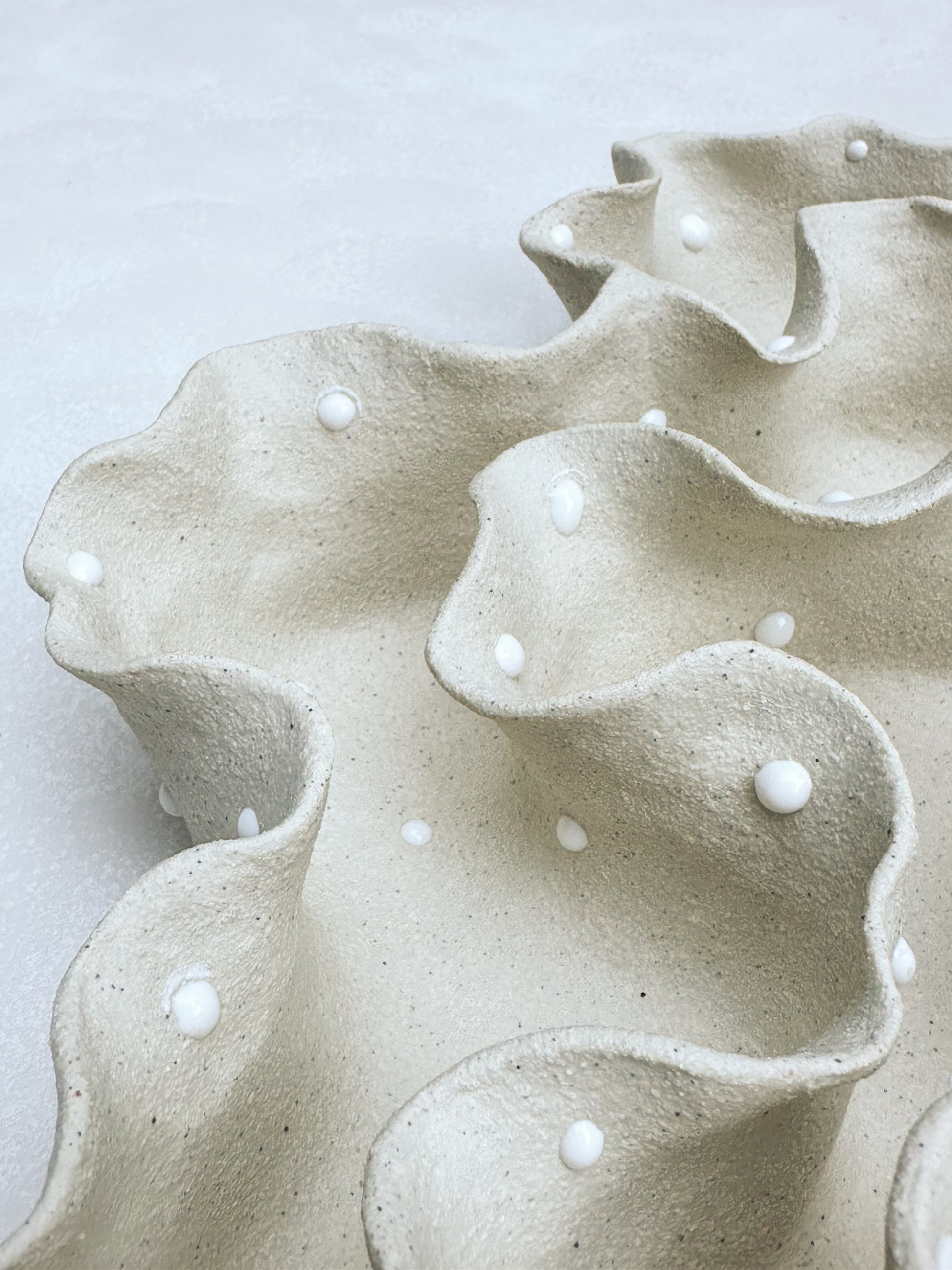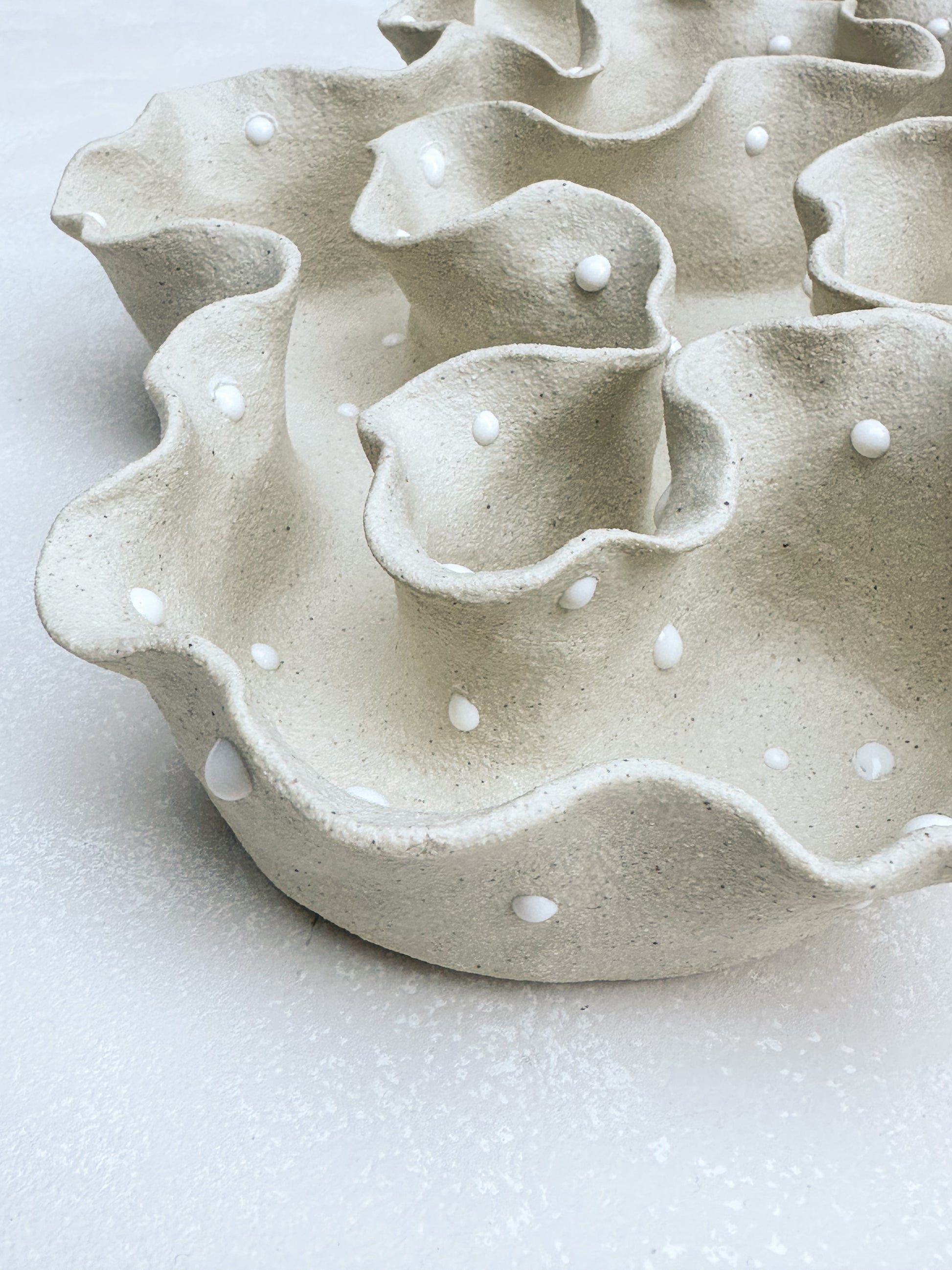 Hand crafted with a textured natural clay body and adorned with white gloss caviar drops.